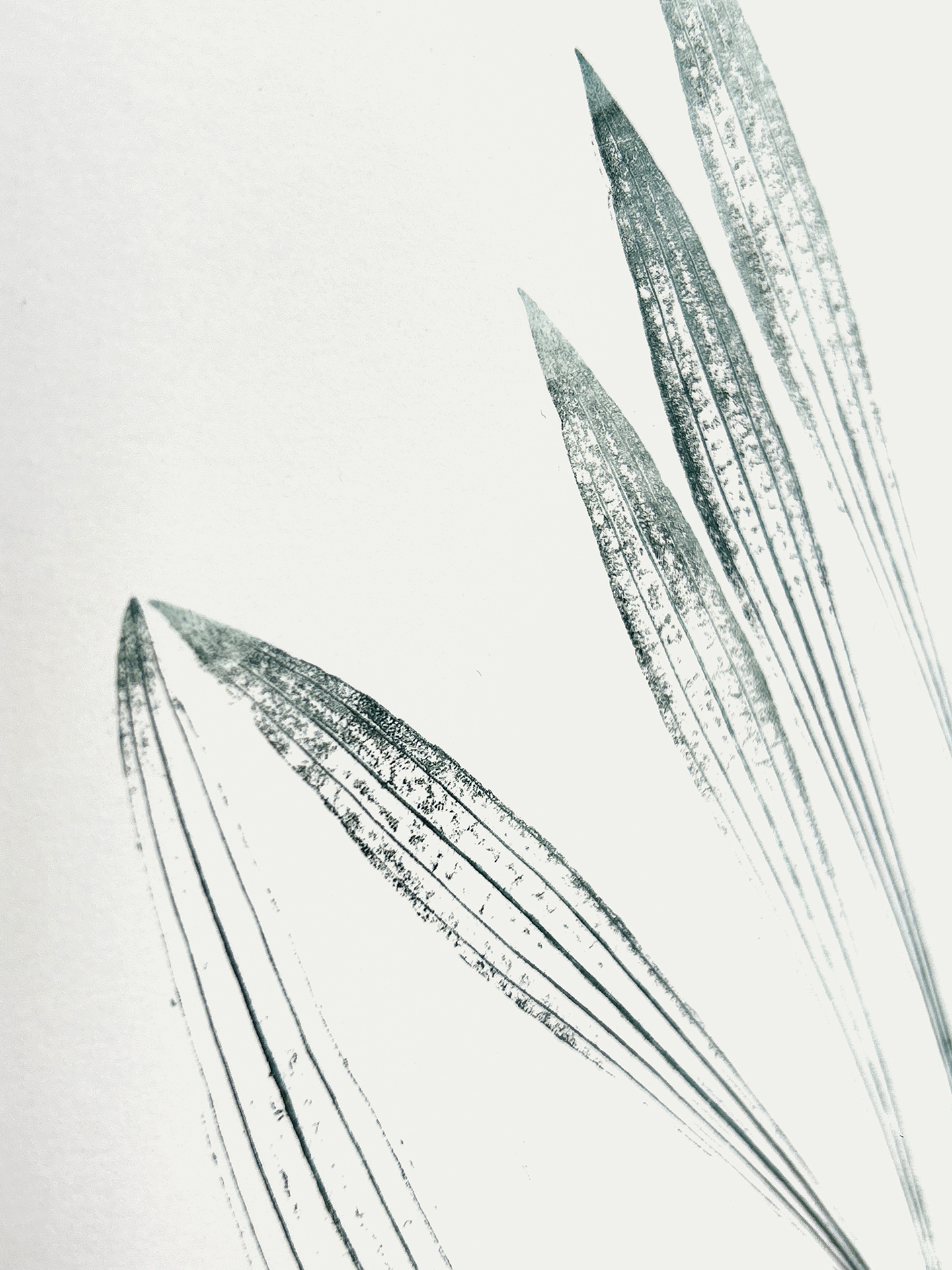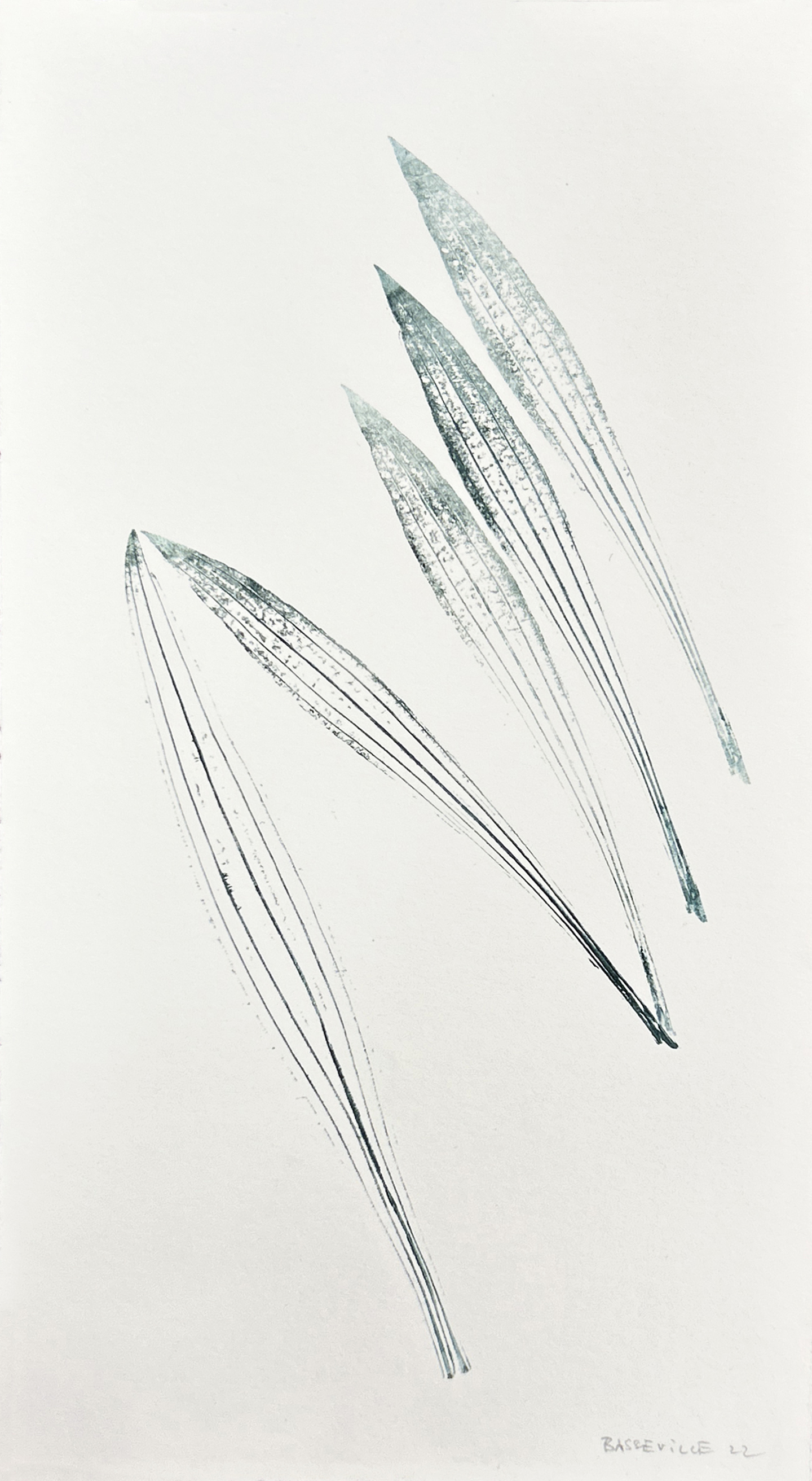 Dans la série Apparaître, Édith Basseville capte l’instant fragile où la nature se révèle. Par empreintes directes de végétaux encrés et pressés contre le papier, elle compose des surfaces sensibles où chaque trace témoigne de la naissance du vivant. L’émergence des formes végétales devient le point de départ d’un récit organique, entre émergence et présence.