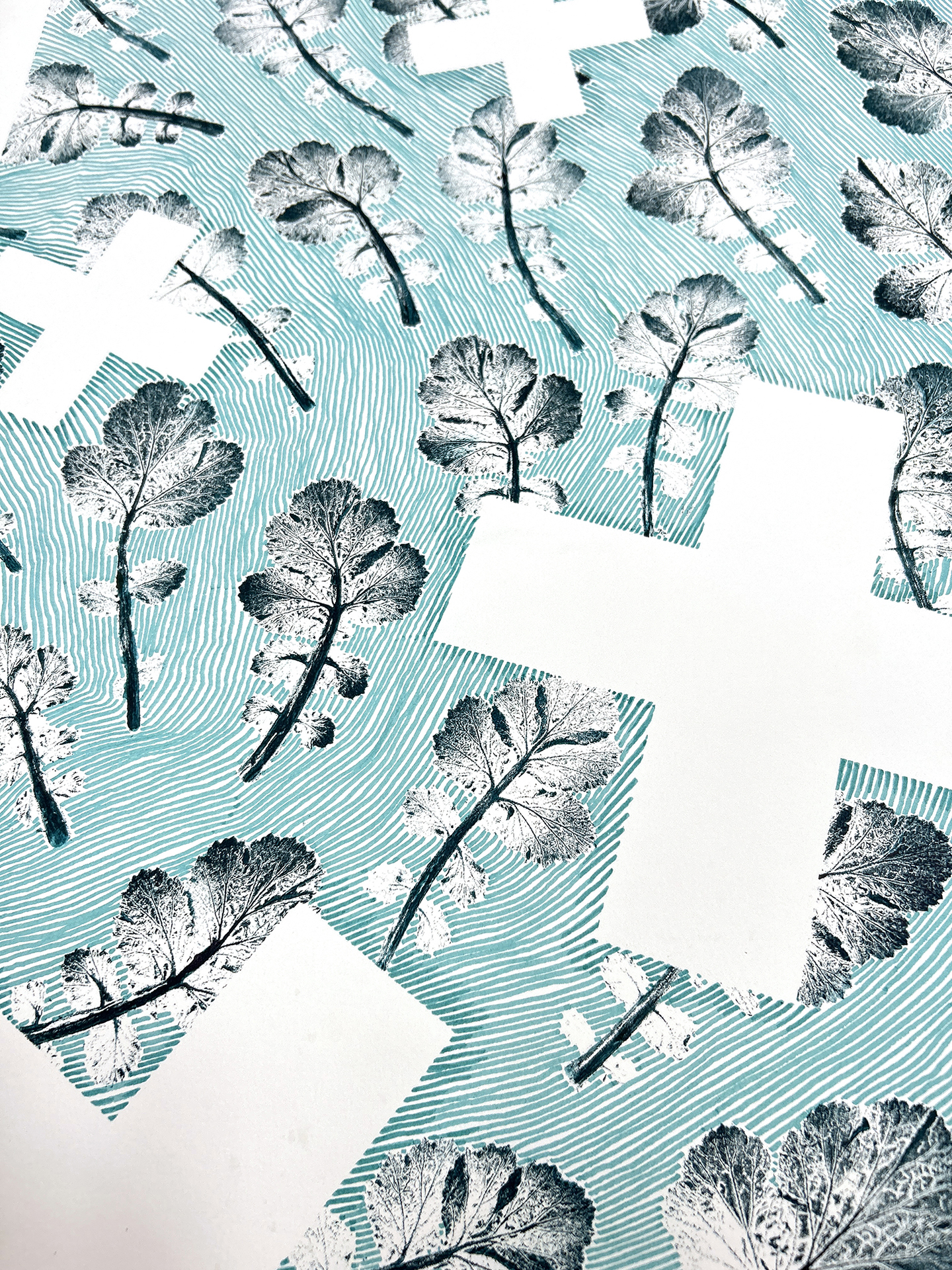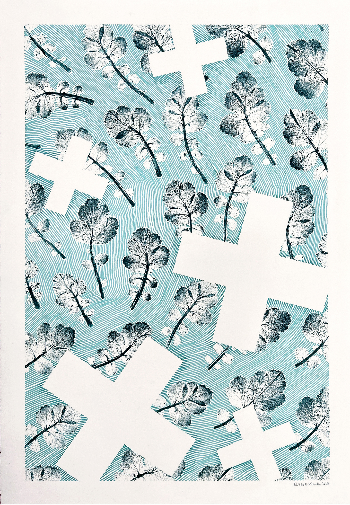 La série Disparaître s’inscrit en contrepoint : les empreintes végétales, rehaussées de lignes au feutre, s’effacent peu à peu dans l’espace de la feuille pour faire apparaître des croix de multiplication. L’artiste y traduit la tension entre présence et absence, vitalité et disparition. Ces monotypes ouvrent une méditation sur la persistance du vivant.