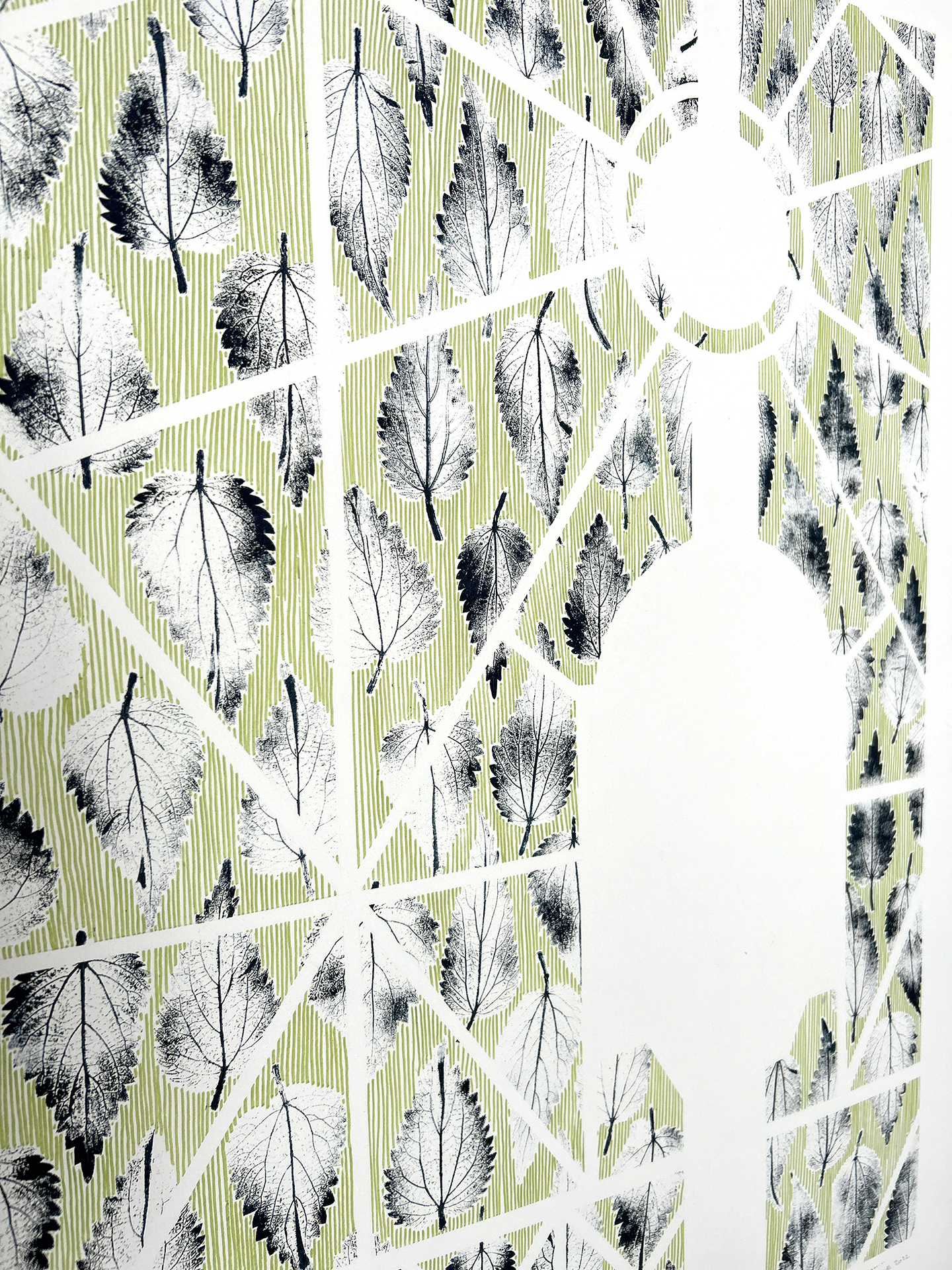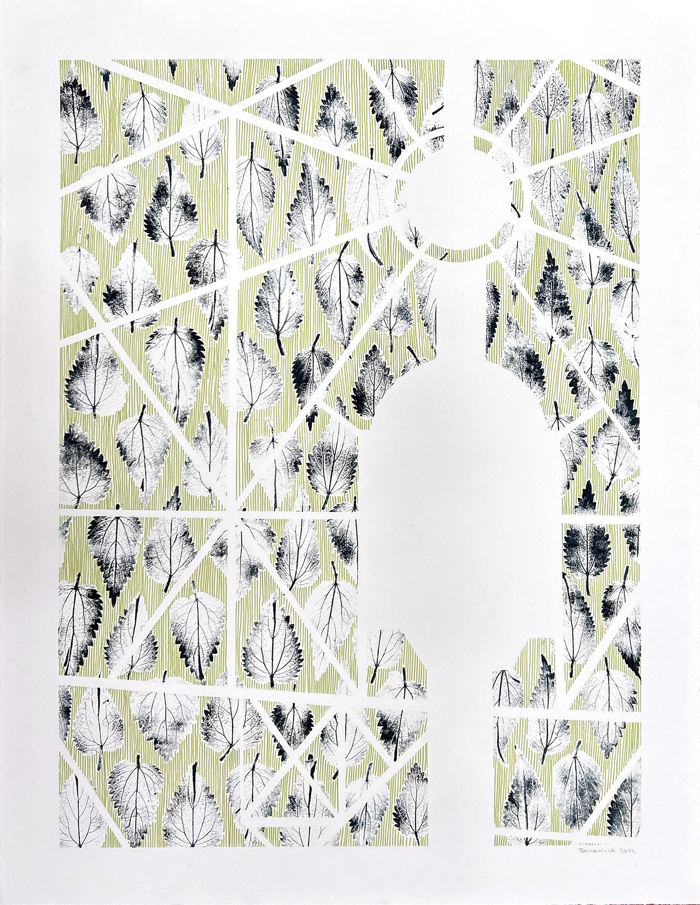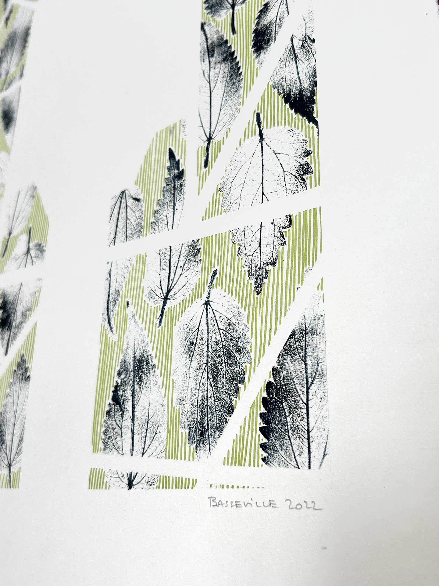 Avec Envahir, la nature prend le dessus. Par empreintes directes de végétaux encrés et pressés contre le papier, puis rehaussées au feutre, Edith Basseville compose des surfaces où les empreintes saturent l’espace d’un plan de jardin à la française (les jardins deVersailles ?). Le végétal s’impose comme l’omniprésence. Ici, l’artiste révèle la puissance inéluctable de la croissance organique, qui déborde et recouvre.