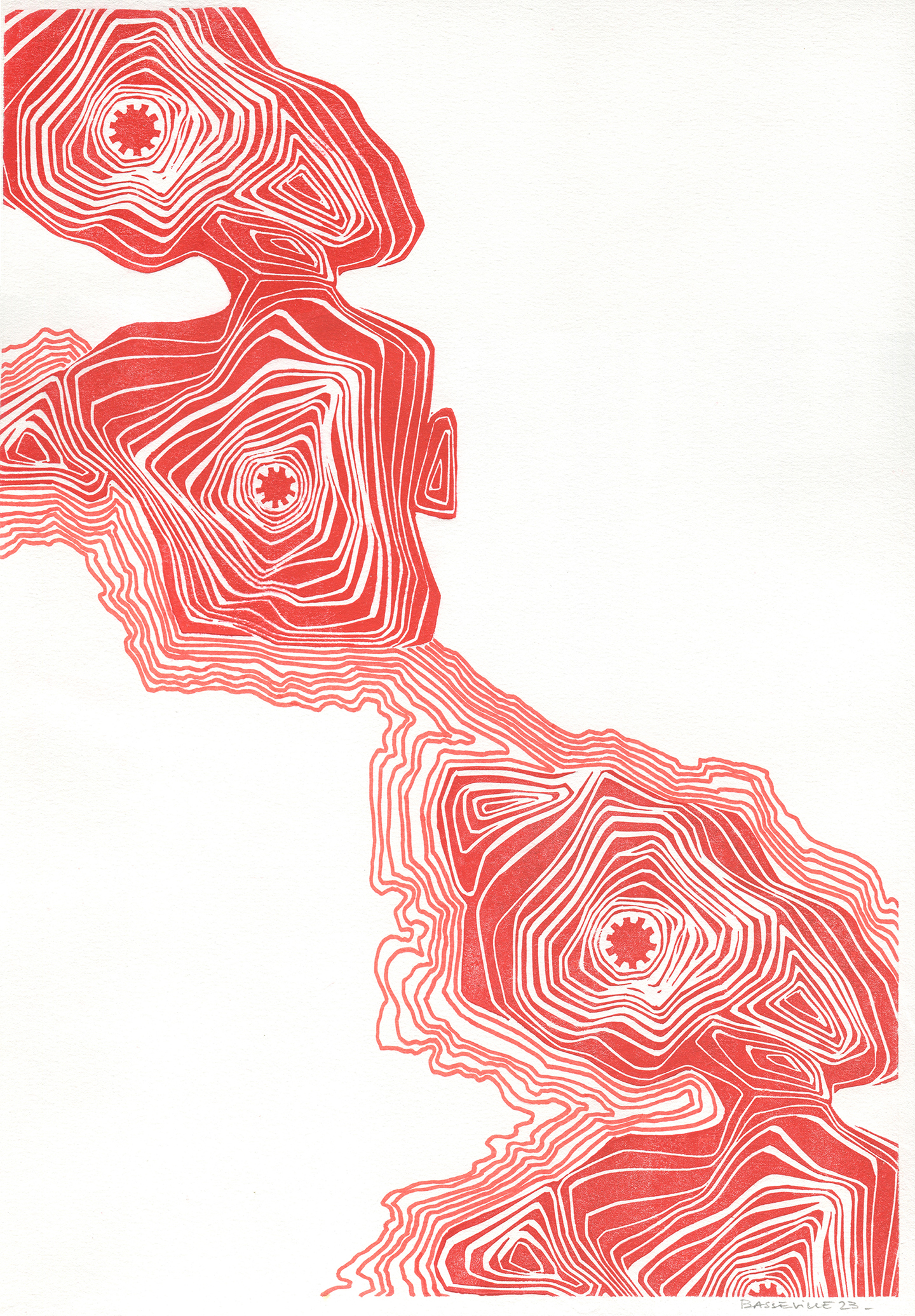 Avec les séries Expansion, Édith Basseville explore le mouvement d’ouverture et de déploiement du vivant. Par des empreintes à l’encre rehaussées de tracés au feutre, l’artiste compose des formes en propagation qui semblent s’étendre au-delà des limites de la feuille. Ces monotypes traduisent la vitalité d’un processus organique en constante croissance.