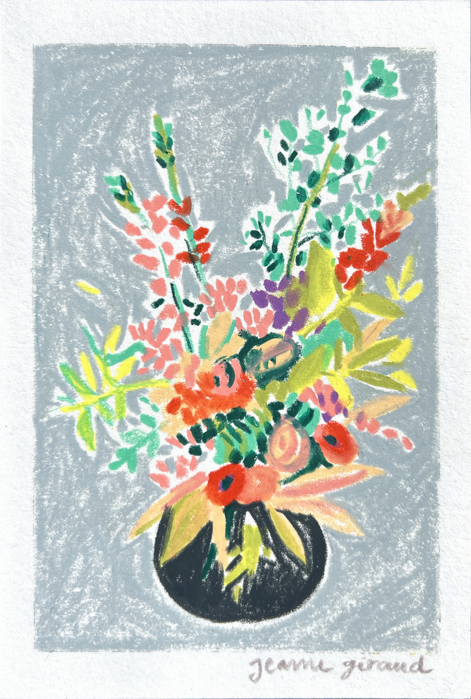 Dans ses compositions de bouquets, Jeanne Giraud célèbre la richesse des couleurs et des matières. Réalisées au pastel gras, ces œuvres convoquent la sensation plus que la représentation fidèle : les fleurs explosent en aplats de couleurs franches, les formes se superposent comme des souvenirs. Entre spontanéité du geste et précision décorative, chaque bouquet devient un paysage intérieur.