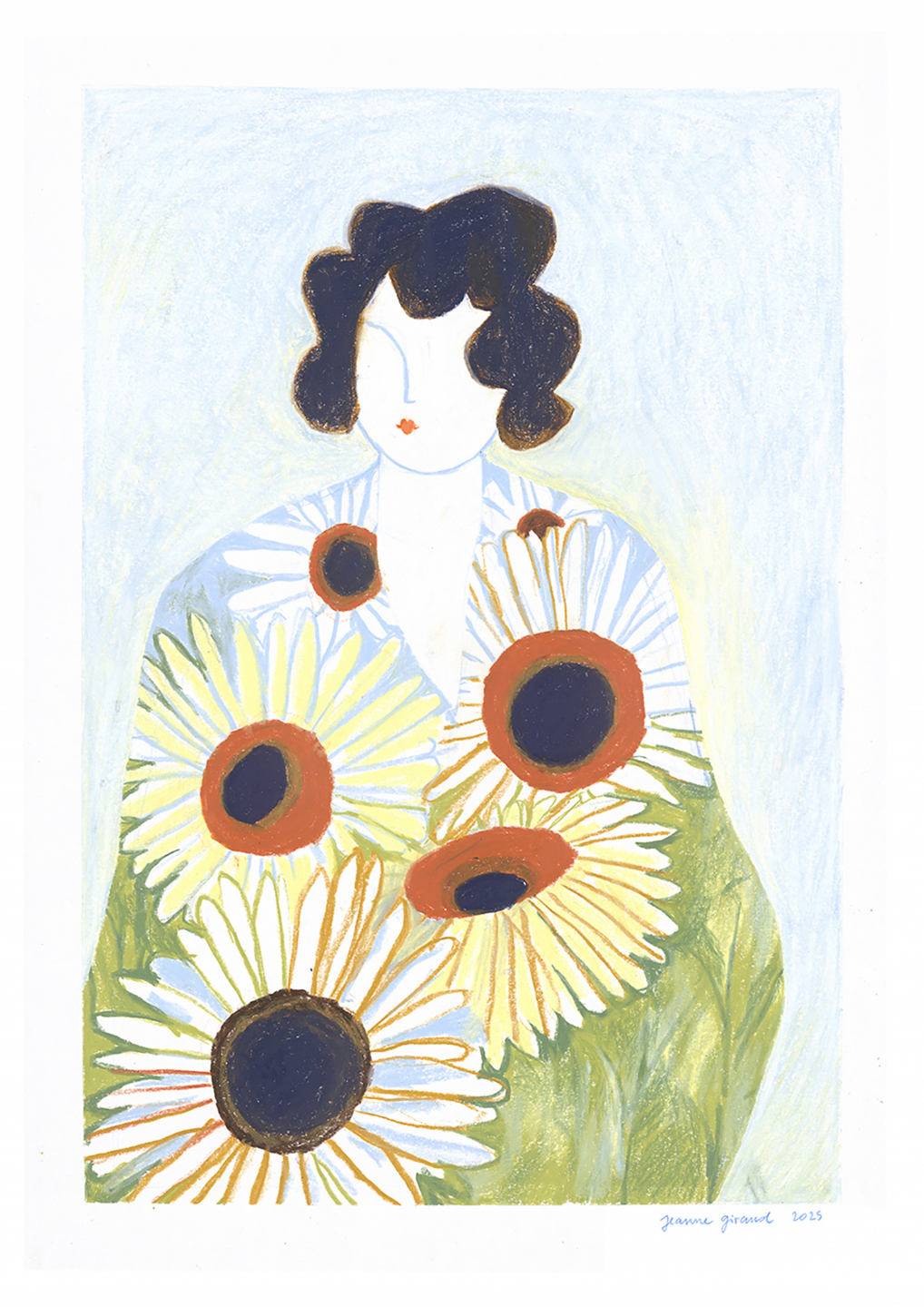 Cette œuvre met en scène une silhouette féminine drapée dans un kimono fleuri, motif récurrent dans le travail de Jeanne Giraud. À travers le pastel gras, l’artiste joue avec les motifs et les couleurs pour mêler le corps et le décor, brouiller les frontières entre figure et ornement. L’image devient tableau vivant, célébration de la couleur et du textile, à la fois graphique et poétique.