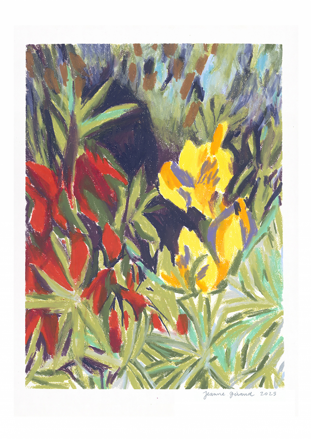 Ces œuvres colorées au pastel gras sont nées au cœur du Parc Floral de Paris, où Jeanne Giraud s’immerge dans la diversité et la vitalité végétale. Chaque fleur devient prétexte à explorer les formes, les contrastes et les rythmes, dans une palette vive et intuitive. L’artiste capte la fragilité autant que l’éclat, traduisant ses impressions florales en images vibrantes, entre abstraction et figuration.