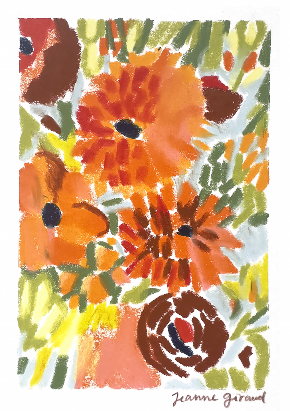 Ces œuvres colorées au pastel gras sont nées au cœur du Parc Floral de Paris, où Jeanne Giraud s’immerge dans la diversité et la vitalité végétale. Chaque fleur devient prétexte à explorer les formes, les contrastes et les rythmes, dans une palette vive et intuitive. L’artiste capte la fragilité autant que l’éclat, traduisant ses impressions florales en images vibrantes, entre abstraction et figuration.